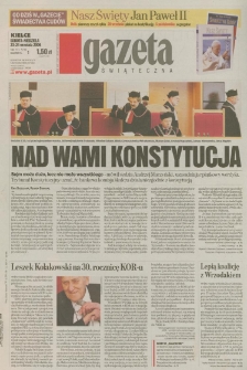 Od 1989, nr 153 [i.e. 152] (9/10 grudz.) do 2012, nr 211=7333 (10/11 listop.) wydanie sobotnio-niedzielne pod tytułem: Gazeta Świąteczna ; Od 1992, nr 45 redaktor naczelny: Adam Michnik ; Motto: do 1990, nr 206 (5 wrześ.) "Nie ma wolności bez Solidarności", od 2003, nr 204 (2 wrześ.) "Nam nie jest wszystko jedno" click here to follow the link