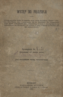 Odbitka prywatna dzieła: "Z dziedziny myśli. Studja filozoficzne", Kraków, nakładem Jana Fiszera, 1900 - przeznaczona dla kół filareckich i dla niezamożnych uczni autora, niemogących nabyć księgarskiego wydania, a obowiązujących się bezwarunkowo nie sprzedawać i nie puszczać w obieg księgarski egz. dla nich przeznaczonych ; Nazwa aut. pod wstępem Bibliogr. prac aut. s. [343-344]
