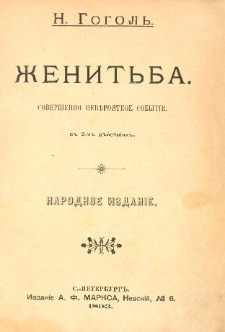 | Gogolʹ, Nikolaj Vasilʹevič (1809-1852), Ženitʹba : soveršenno nevěroâtnoe sobytìe : v 2-h dějstvìâh | 12 paź 2023 |