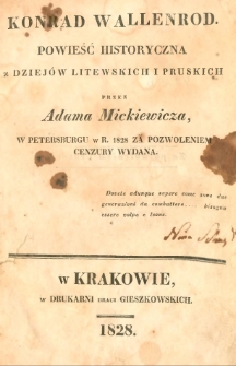 | Mickiewicz, Adam (1798-1855), Konrad Wallenrod : powieść historyczna z dziejów litewskich i pruskich | 12 paź 2023 |