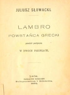 | Słowacki, Juliusz (1809-1849), Lambro : powstańca grecki : powieść poetyczna w dwóch pieśniach | Oct 12, 2023 |