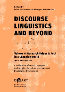 Discourse-Analysis Round table “D-ART” as an international project based on the Round Table discussion format, which can be viewed as a collection and construction of the ways contemporary linguistics in Eastern Europe and beyond, implies investigating as it does such a macro-level unit as discourse. Collective reflection does not prevent individual voices from being represented to the benefit of discussion and field grounding. The genres involved vary from research and opinion articles to individual insights and reflections, with a view to enabling Discourse Linguistics to present itself in various aspects and from different focal points. It makes the approaches grounded and balanced within the frameworks existing in the region and beyond. D-ART is focused on giving the scholars engaged in the field an opportunity to present themselves and their findings. Volume 6 is a special multilingual volume, which represents the community of the Field Committee of the Linguistics of Discourse – FCLD (http://www.ilij.ujk.edu.pl) of the International Committee of Slavists, part of Unesco educational programme. In its four Round Tables, the participants of the volume: develop the idea of content-context transformational nature of discourse in functioning; discover the undercrossing specifics of social-individual meaning-making; implement discourse expertise in different domains of human activities – human rights, academic teaching and research, behavioural and interactive practices. One of the goals of this volume is to familiarise the reader with the variety of issues which have been discussed lately. The volume does not include all the articles submitted for publication. Consequently, we are open to continue sharing multilingual presentations to give the chance to all scholars who wish to make a personal contribution to our multilingual experiment. Multilanguage specifics of the volume have a special task to collect data for a future multilingual dictionary of the terminology of discourse research – Discourse Linguistics and its satellite disciplines, focusing mainly on its research object and methodology in their variation and development, just as qualitative research perspective within its elements of subjectivity, intentionality, and cultural motivation, but also on verification practices, which brings the qualitative perspective the objectivity as such and, thus, a definite balance.