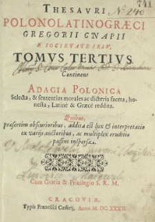 Thesauri Polonolatinograeci Gregorii Cnapii e Societate Iesu tomus tertius Adagia polonica selecta